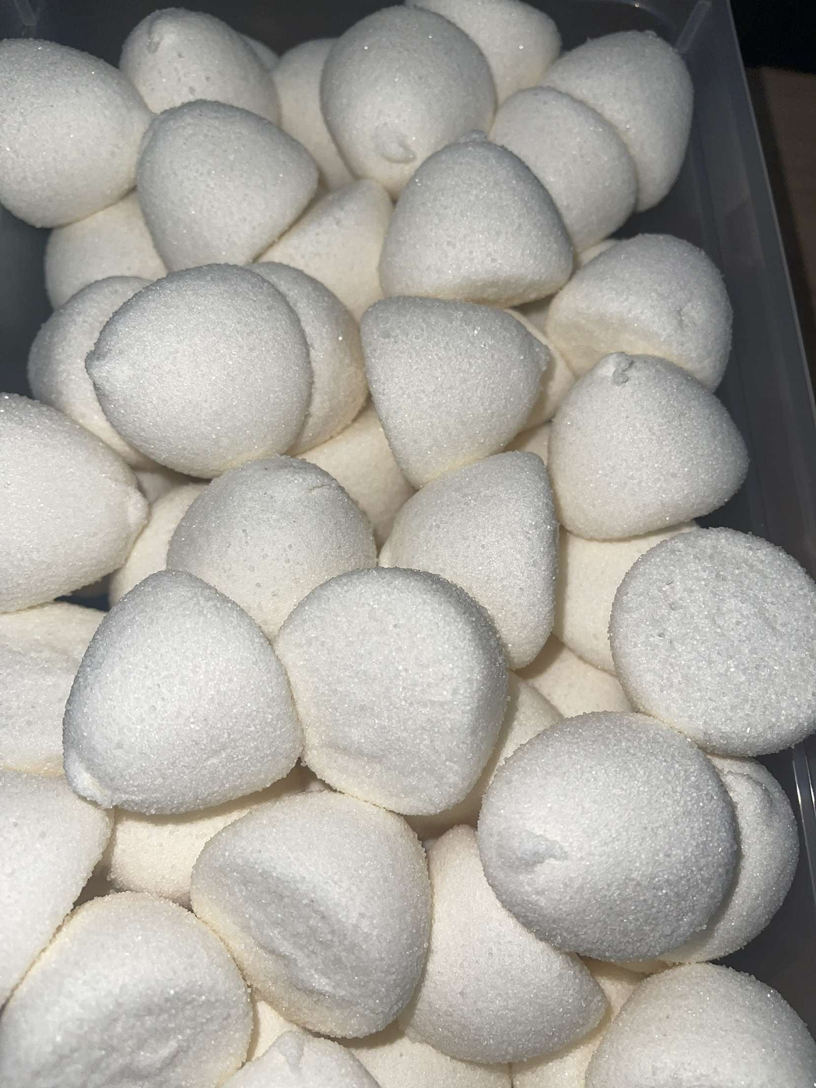 Sirop de glucose et de fructose, sucre, eau, gélifiant (gélatine), protéine de lait, arômes, colorants (E104, E131).