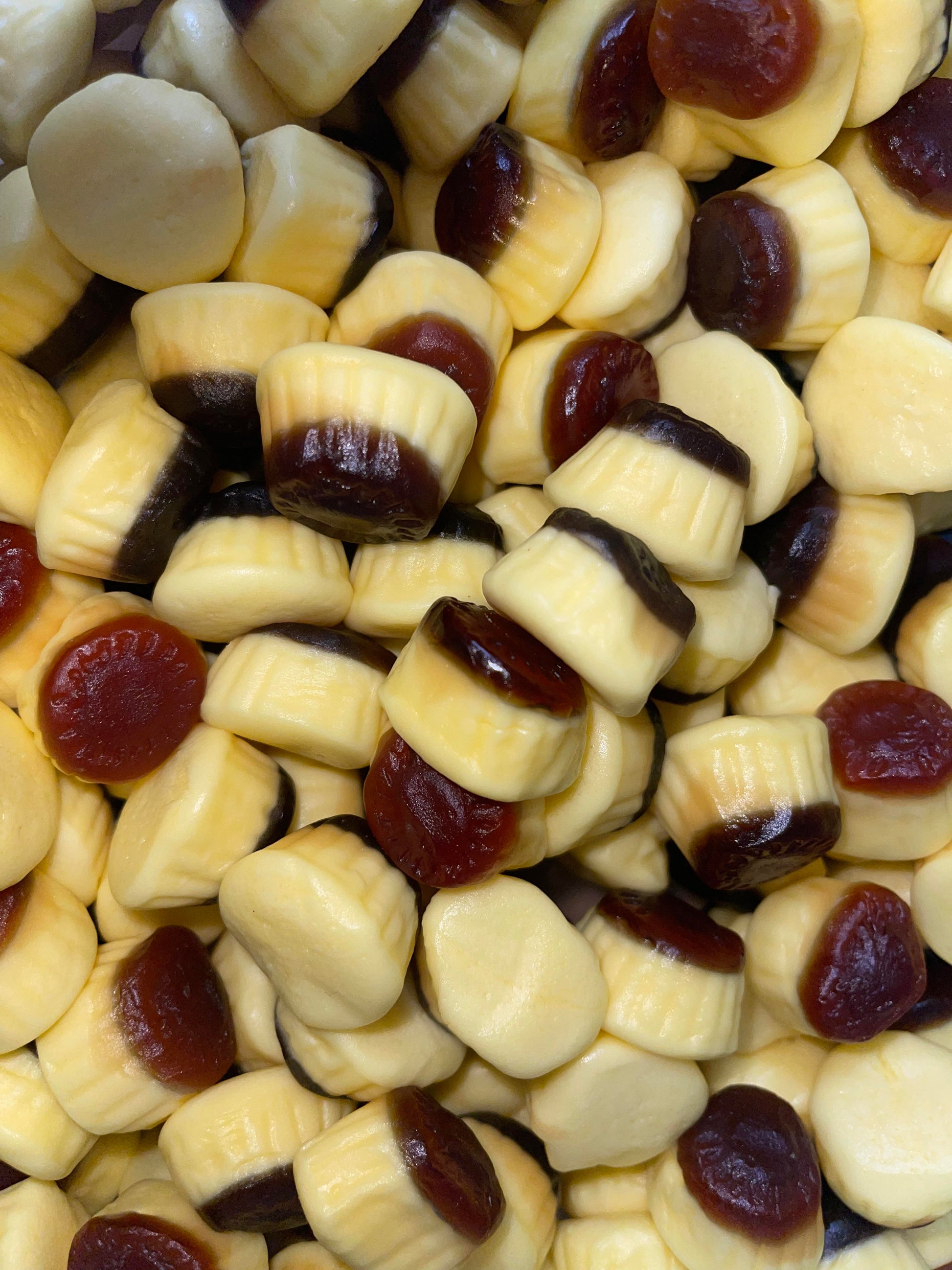 Sirop de glucose, sucre, eau, gélatine de boeuf, amidon modifié de pomme de terre, acidifiants : E270, E330, arômes, agents d'enrobage : huile végétale (palme), E901, E903, arômes, colorants : E150c, E100. Sans Gluten.