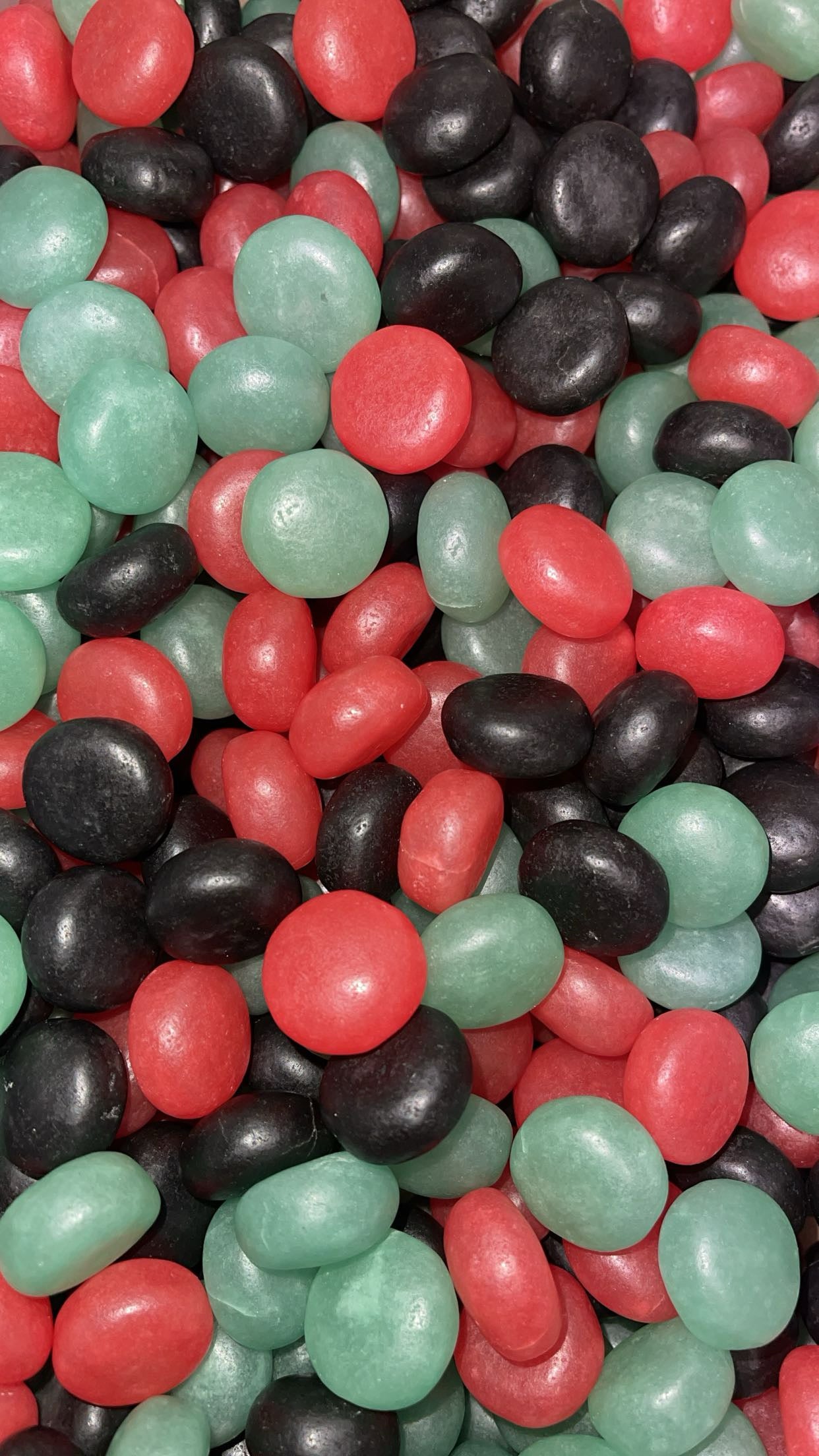 Sucre, sirop de glucose, amidon, dextrose, acidifiant : acide citrique, correcteur d'acidité : citrate monosodique, arôme, colorants : curcumine, carotènes végétaux, bleu patenté V, anthocyanes, charbon végétal, agent d'enrobage : cire de carnauba.