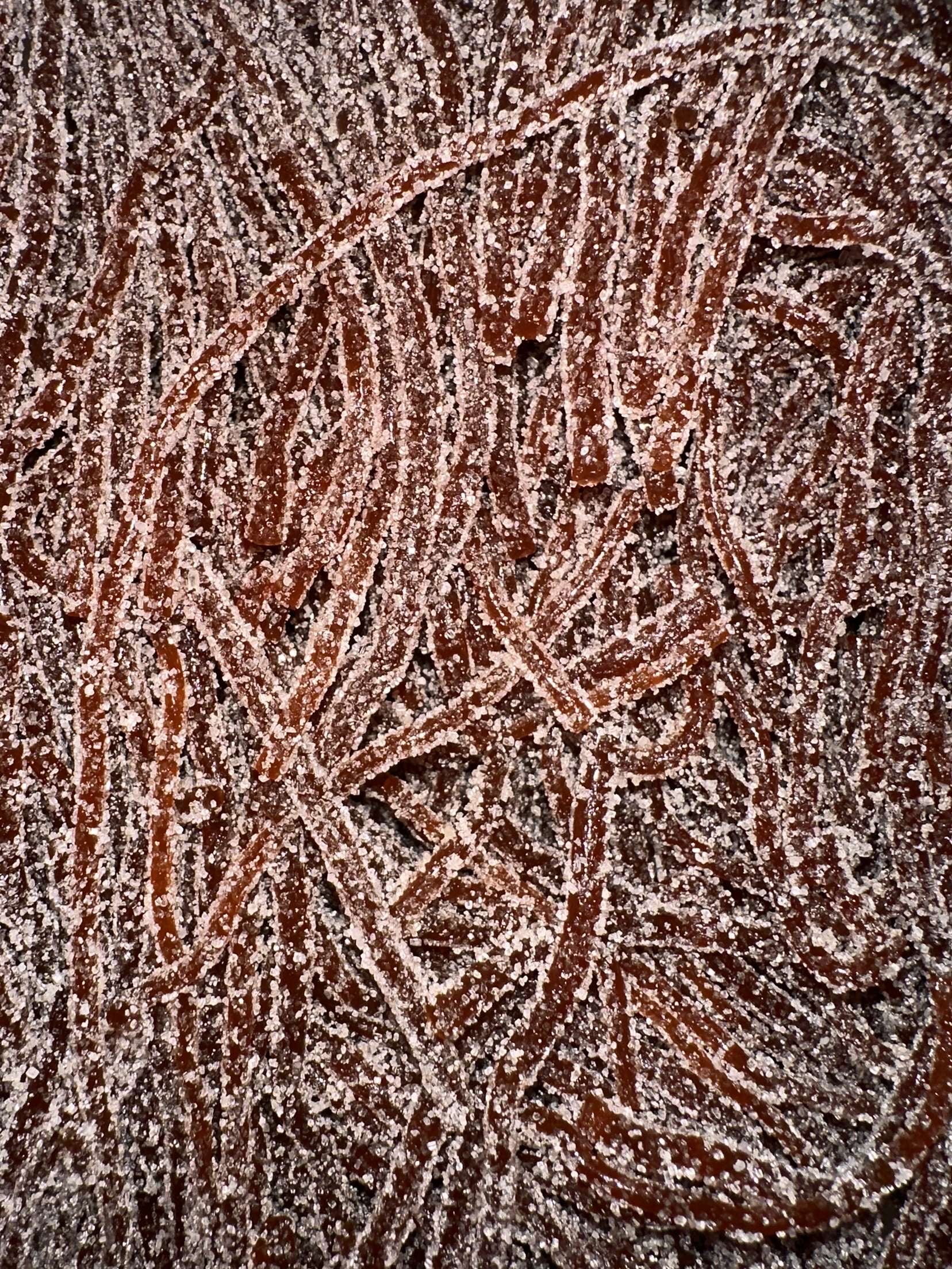 Sirop de glucose-fructose, amidon, sucre, sirop de sucre inverti, farine de blé, eau, acidifiants E330, E296, maltodextrine, correcteur d'acidité E-332, graisse vegétale (palme), arome artificiel, agents d'enrobage : cire de carnauba, émulsifiant E-322, colorant E-150c. Contient du GLUTEN.